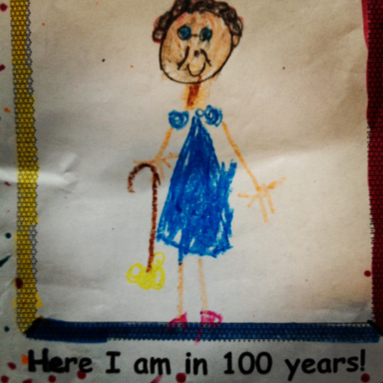 This was part of some 100 project that the first graders were doing and I just adore it. The little perm, the puffy sleeves, the pink shoes, the fresh tennis balls on the cane. We should all aspire to look that good at the ripe old age of 106.