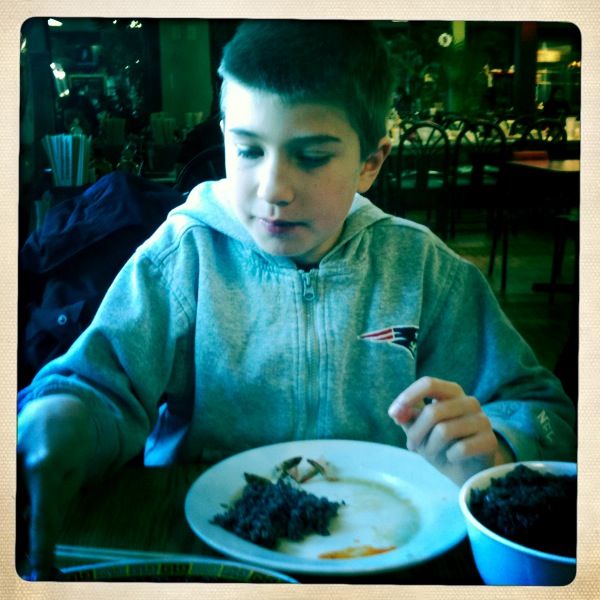 We spent the next hour feasting, and I mean FEASTING, on a savory meal of vibrant purple sticky rice, a seafood stir fry with the most amazing greens and salty delicious sauce, and the mother of all pork dishes, the barbequed pork belly. I’ve had pork belly before and I thought it was just really thick bacon, but this had more actual pork on it, a layer of crispy fat and then a crackly caramel colored crust. Seriously, you guys, Saint James and I were in hog heaven and in between happy mouthfuls we managed to agree that snow days are good, that Asian kids are super cute and that we have to take the rest of our family to Destiny Cafe, like, PRONTO! I must go back and try the steaming bowls of pho that everyone seemed to be favoring on that cold day. And more of the pork belly of course. And those greens. Sweet mother, those greens! But most delicious of all was my stolen time with Saint James and the knowledge that as long as I’m willing to take him somewhere tasty and he’s willing to follow, all will be well in our world.