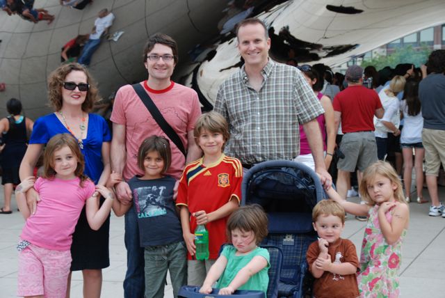 On our drive to Michigan we stopped in downtown Chicago for a night and got to hang out with one of my favorite people in the world, my brutha from anotha mutha, my college partner-in-crime: The Fox, his hilarious wife, Sweet Cheeks, and their three adorable kids. We thoroughly fondled the shiny bean in Millenium Park, walked around the city for a while, and had a delicious, albeit chaotic, meal of Spanish tapas at Emilio’s. Our collective six children were rambunctious and lively, but essentially as well behaved as could be expected. I have seen better behaved children, but they’re usually sitting in the shadow of excruciatingly boring looking parents. The first thing Devil Baby and their youngest did when we sat down, was to scurry under the table. We tried half heartedly to get them to come out, but abandoned the notion in favor of a couple pitchers of sangria and some good catch-up chatter. My favorite moment came later in the dinner, when the kids had started to fan out and scuttle around the restaurant: The Fox gingerly lifted the corner of the table cloth and tried to shoo the little ones back under the table. That’s exactly the kind of off-the-cuff, lesser of two evils, short cut, bandaid, whatever works in this moment parenting that we embrace, and precisely what I would expect from my friend who procrastinated his Heart of Darkness paper for so long that he actually entered the heart of darkness, turning the whole thing into a long, drawn out, tortuous extravaganza that still ended in a painful all-nighter. It brought me endless pleasure to watch him wrangle the two year old boy who was determined to give his mother a heart attack by pitching along the sidewalks of Chicago as fast as his short little legs would carry him. It was only a few chaotic, funny hours, but thoroughly soul satisfying. Everything that was quirky and funny about The Fox and Sweet Cheeks before they had kids, inflects their parenting and their family in all the lovely ways you’d hope. And now, we will make a plan to see each other again somewhere with long table cloths and no murderous taxis.